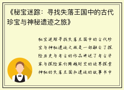 《秘宝迷踪:寻找失落王国中的古代珍宝与神秘遗迹之旅》
